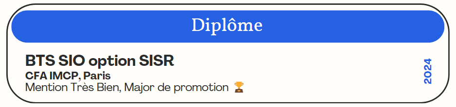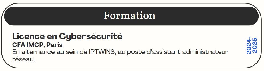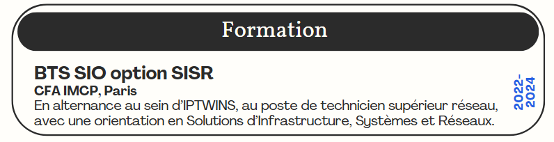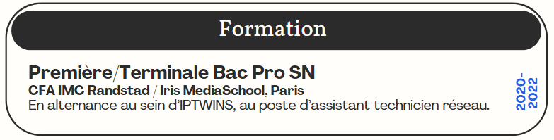 Animé par une passion pour l’informatique et les réseaux, j’ai construit un parcours alliant formation académique et expériences professionnelles. De mes débuts en stage d’observation au CNAM à mon évolution en tant qu’administrateur réseau chez IPTWINS, chaque étape m’a permis d’acquérir une expertise approfondie en administration système, cybersécurité et architecture réseau.