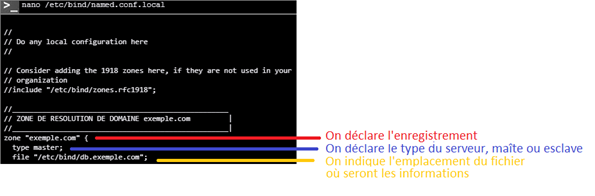On va commencer par aller dans le fichier /etc/bind/named.conf.local et on va ajouter ces lignes :