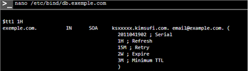 Ensuite nous allons créer ce fichier db.exemple.com à l’emplacement indiqué ci-dessus pour y indiquer des informations telles que les IP :