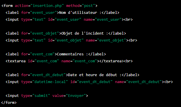 En résumé, ce code établit une connexion à une base de données MySQL, prépare une requête SQL pour insérer des données dans la table « incidents » et exécute la requête en utilisant les données saisies par l’utilisateur dans un formulaire HTML qui pourrai être le suivant :