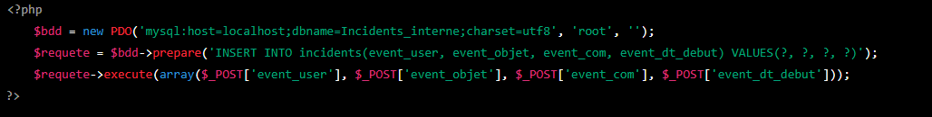 : Cette ligne prépare une requête SQL pour insérer des données dans la table « incidents » de la base de données. La requête utilise la syntaxe SQL standard d’insertion de données et spécifie les noms des colonnes auxquelles les données doivent être insérées. Les valeurs à insérer sont représentées par des marqueurs de paramètre (les symboles ‘?’ dans cet exemple). Les marqueurs de paramètre sont utilisés pour éviter les attaques par injection SQL et sont remplacés par les vraies valeurs lors de l’exécution de la requête.$requete->execute(array($_POST['event_user'], $_POST['event_objet'], $_POST['event_com'], $_POST['event_dt_debut']));