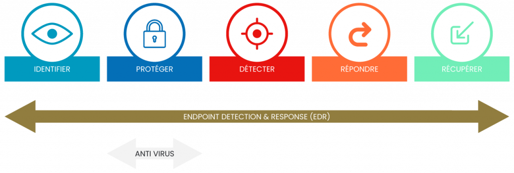 - EDR : Va au-delà de la prévention en offrant des capacités de détection, d’investigation et de réponse aux menaces, même celles qui échappent aux antivirus traditionnels.